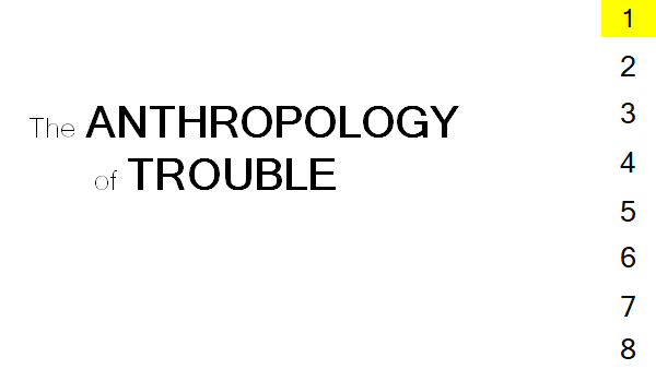 Rappaport R (1993) Distinguished lecture in general anthropology: The anthropology of trouble. American Anthropologist. 95 (2): 295-303.
