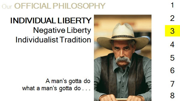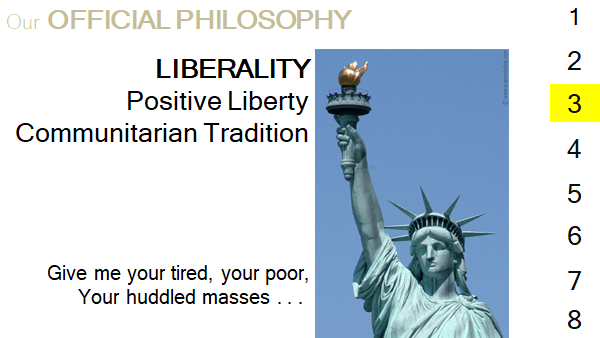 Why preoccupy ourselves with liberalism?[1] Because I want us to agree with social critic Alan Wolfe that “liberty” is America’s “official philosophy” (2009:21). Liberty, the “sensation of freedom,” defines our personal and public sensibilities.[2] Liberty, as a “structure of feeling,” operates among us much like Ubuntu does among Southern Africans, or the Harmony Way among our indigenous Turtle Islanders.[3] Liberty may not be the only characteristic of the mainstream American experience, but it is the essential one.