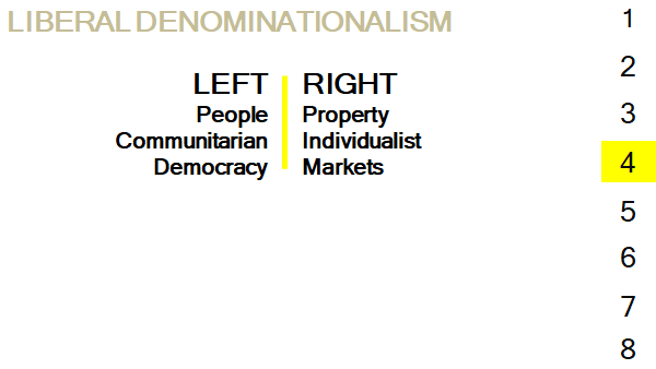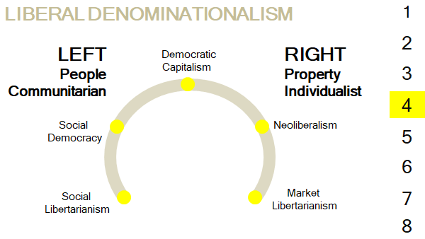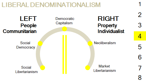In fact, there is a spectrum of liberal denominations on the left and the right. Each denomination is enshrouded in ideological orthodoxies and entrenched pieties. Most of us join comfortable congregations in one or another of them. In the post-war period we thought we had reached equilibrium in the middle—“the end of history,” so to speak—and called it “democratic-capitalism.” On the left, those disappointed with such centrism because it fails to resolve racial exclusion and class inequality, emphasize greater democratic control and public participation, or “social democracy.” On the far left, some insist on even more direct democratic control over government and markets, and autonomy for their local communities and their personal lives. These advocate a form of “social libertarianism.” On the right, disenchantment with democratic-capitalism leads to demands for greater market freedom and laissez-faire, neoliberal free market economics. And on the far right a “market libertarianism” calls for its own form of property-based anarchism and complete freedom from government.