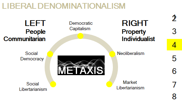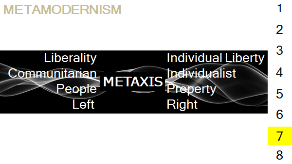 Our centerline is more than an averaging of public opinion. It is a perennial struggle between social opposites, sometimes violent either rhetorically or physically, to form a common center. I want to call this centering sensibility metaxis. Metaxis is the perception that the common good is always somewhere between or beyond our polarities. The word “metaxis” means to oscillate between poles of imagined opposites in the hope of being enriched by both, and thus create something better from both of them—like the old social movement street chant that goes, “We’re not Left! We’re not Right! We’re out in Front!” Metaxis is the operating center of the logic of historical liberalism. I’ll have more to say about it later when we discuss metamodernism.