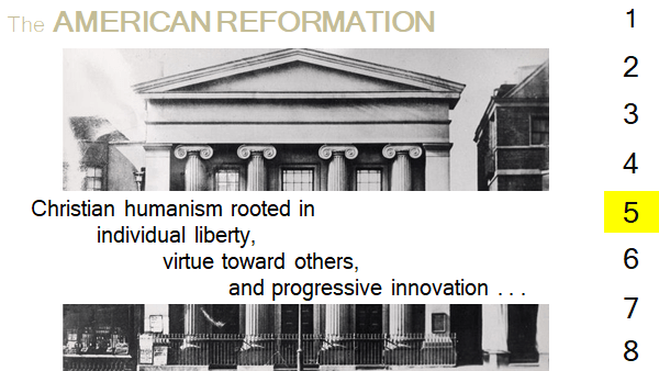 In brief, The American Reformation radicalized the European Reformation’s central value—liberty of conscience—and extended its meaning to emphasize individual free will, moral agency, and private judgment. It also incorporated into theology many Enlightenment values such as rationalism, free thinking, common sense, self-determination, social equality, self-expression, and traditional political liberties. Above all, the American reformers stressed moral virtue—personal and civic—as the proof of theological claims. Its open-minded advocates argued, in fact, that any belief must be proved virtuous by the good it produces in society. Taken together, these values constituted a “liberal” way of life, a form of Christian humanism rooted in individual liberty, virtue toward others, and progressive innovation.