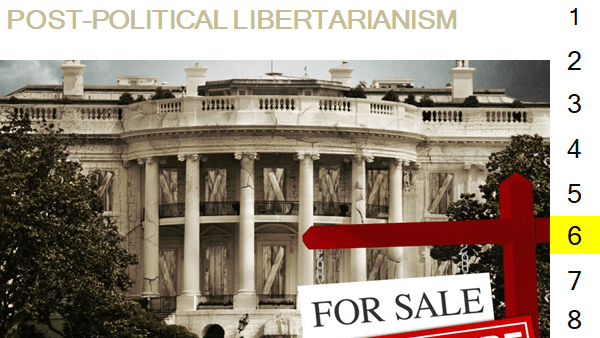 Anarchism also defines our new mood. We can take “anarchism” in the sense of what many of us fear: the breakdown of social order into chaos. And some of this is happening. On the other hand, and this is more descriptive of our present circumstances, anarchism is also the principled quest to live free from the coercion of bureaucratic hierarchies, both public and private. Anarchism embraces radicals on the left and on the right. It also describes the social phenomenology of the marginalized underground—of the poor, of minorities, and of reformers searching for creative alternatives—that lives below the radar of our official institutions and ideologies (Scott 2012). Anarchism in both its chaotic and principled forms is a feature of our emerging post-political, libertarian transformation.
