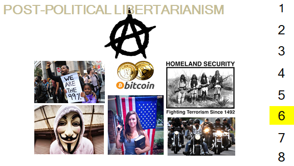 - Anarcho-capitalism: This, on the far right, is a self-described anti-state/anti-corporation movement seeking to organize social life around unimpeded, individualist market exchanges. It claims this name for itself (Chartier and Johnson n.d.).