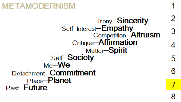 What kinds of oppositions are linked in the metamodern vision? The list is long. On the cultural level, for example: irony and sincerity, self-interest and empathy, competition and altruism, critique and affirmation, realism and romanticism, matter and spirit. On the social level: self and society, “Us” and the Other, detachment and commitment, place and planet. A metamodern mood affirms the past, discerningly, and takes moral responsibility for the future. It might be that we can even uncover a hidden unity behind our excessive pluralism.