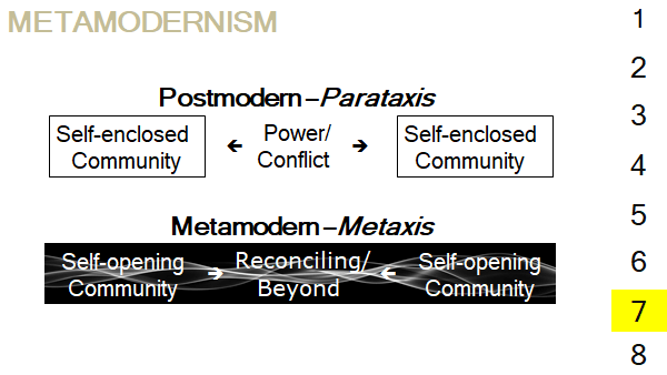 Certain themes, the substance of this new mood, come through in the various literatures that I lump together as “metamodern.” These literatures include cultural theory which explicitly uses the term (as noted above), but extend to the “metaxological” metaphysics of philosopher-theological William Desmond, and to related fields such as critical realism and neo-cosmopolitanism.[16] Generally speaking, metamodernism reacts against modernism’s overly-quantified utopian naiveté. Foremost, however, it is a reaction against postmodernism’s excessively critical irony; its deconstruction of the “self”; its loss of master narratives; and its claim of “the end of everything,” of history, of truth, humanism, art, of progress; all of which together breed cynicism and passivity in the face of our troubles. Along with this, metamodernism protests the permanent postmodern struggles between identity communities, left and right, minorities and majorities—many with legitimate grievances, many not—each contending for its own interests in a sea of social and political power. It protests a pluralistic society that has been trivialized as a funhouse of mirrors where all we see are distorted images of ourselves, and become idiots to each other. Metamodernism contrasts postmodern parataxis—the setting off of self-enclosed, incommensurable communities over against each other in a position of conflict—with metaxis—a standing between and beyond, looking to expose and reconcile the myriad tensions that separate us.
