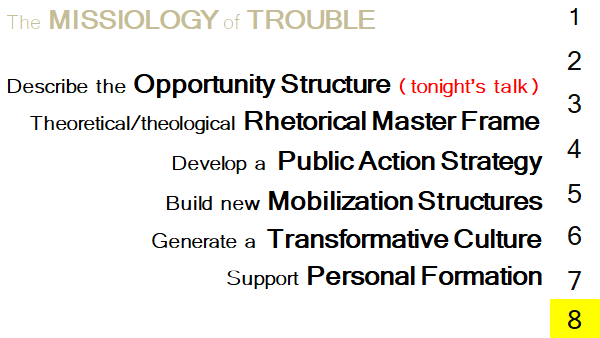 - Theoretically describe the existing social and cultural opportunity structure—our context—that both constrains and liberates our public witness. Tonight’s talk fits into this category.